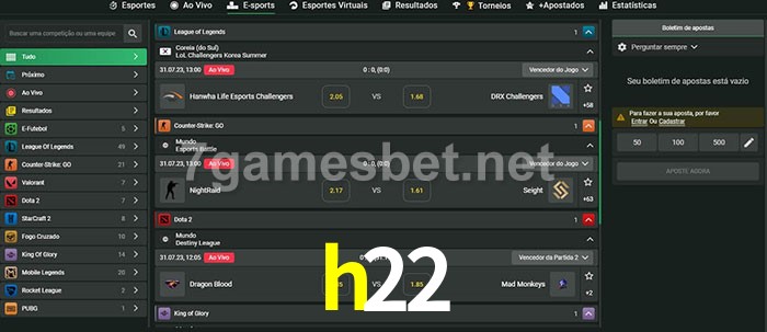 O h22 oferece uma grande seleção de opções de apostas em e-sports com probabilidades competitivas